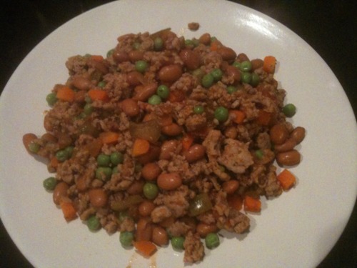 Fry up the turkey, drain off the fat. Add garlic powder, cayenne and hot sauce to the meat while it frying. At the same time start boiling the peas and carrots. While that is happening drain and thoroughly rinse the beans. When the meat is cooked through, add the beans to it and stir them in. Continue heating over medium-low heat. When the peas and carrots have boiled for a minute or so, drain them off and toss them into the meat-bean mix. Stir it all up. Then add a generous helping of hot, chunky salsa (you can use whatever type you like I suppose, I found some interesting new varieties in the organic food section of the grocery store).